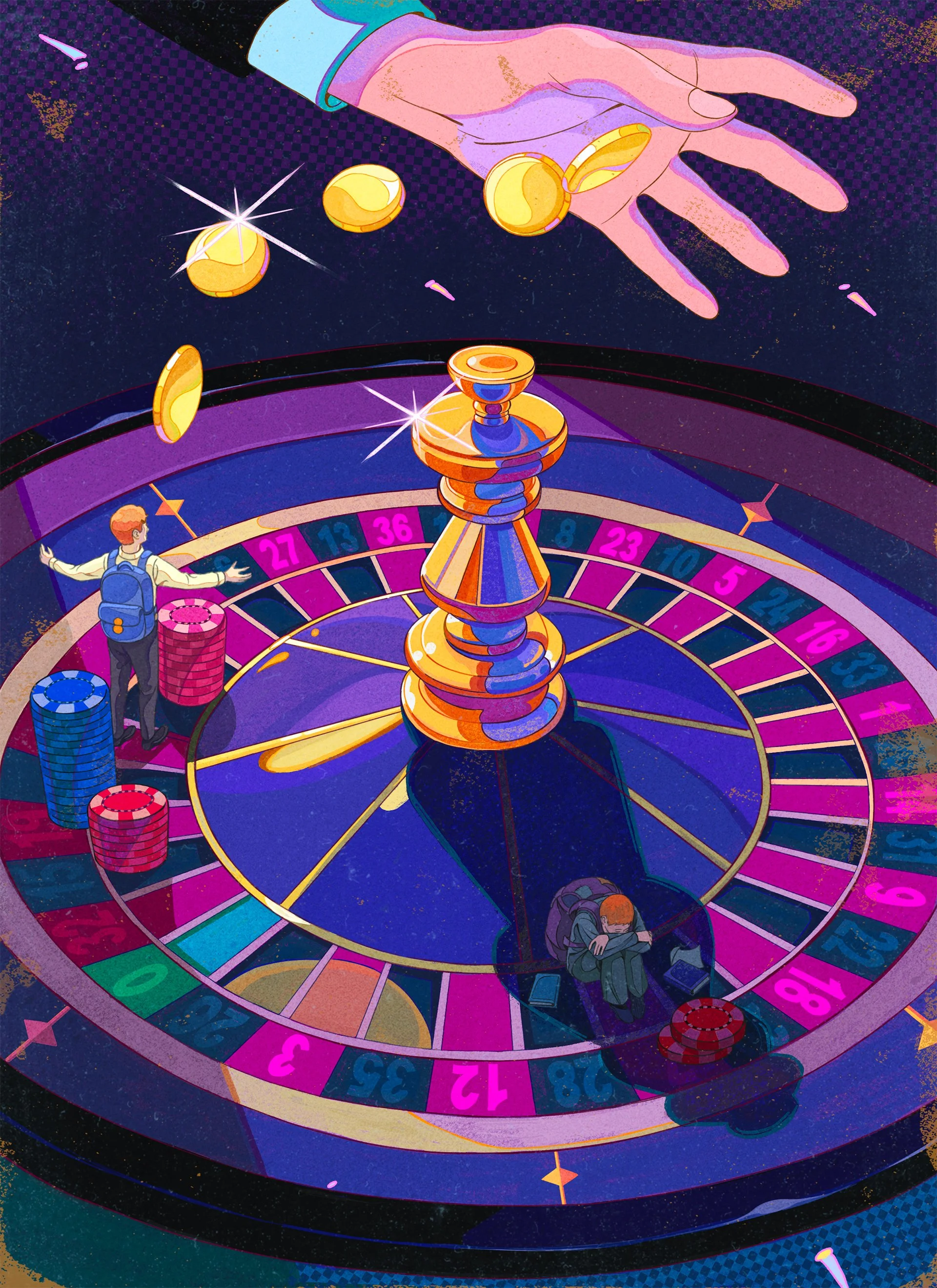 This illustration depicts the hard situation a couple of lovers faces when they are maintaining a delicate romantic relationship. When there is one holds a condescending attitude while the other one pays without complaint, the relationship starts to lose balance and gets more and more fragile. In an unfair love relationship, all beautiful things are superficial and perishable.